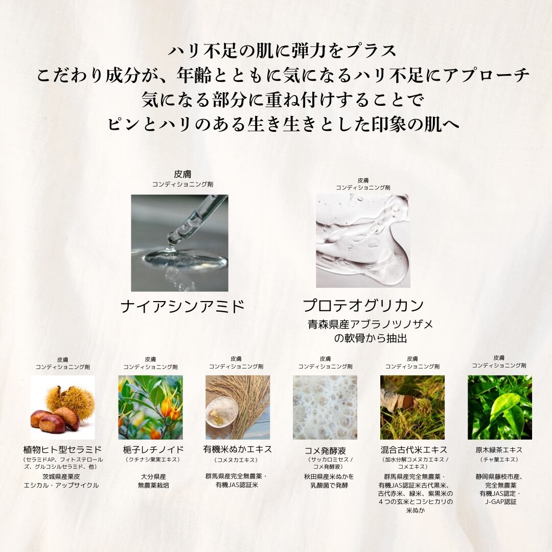 ◯ハリ不足の肌に、こだわりの成分が弾力を与える